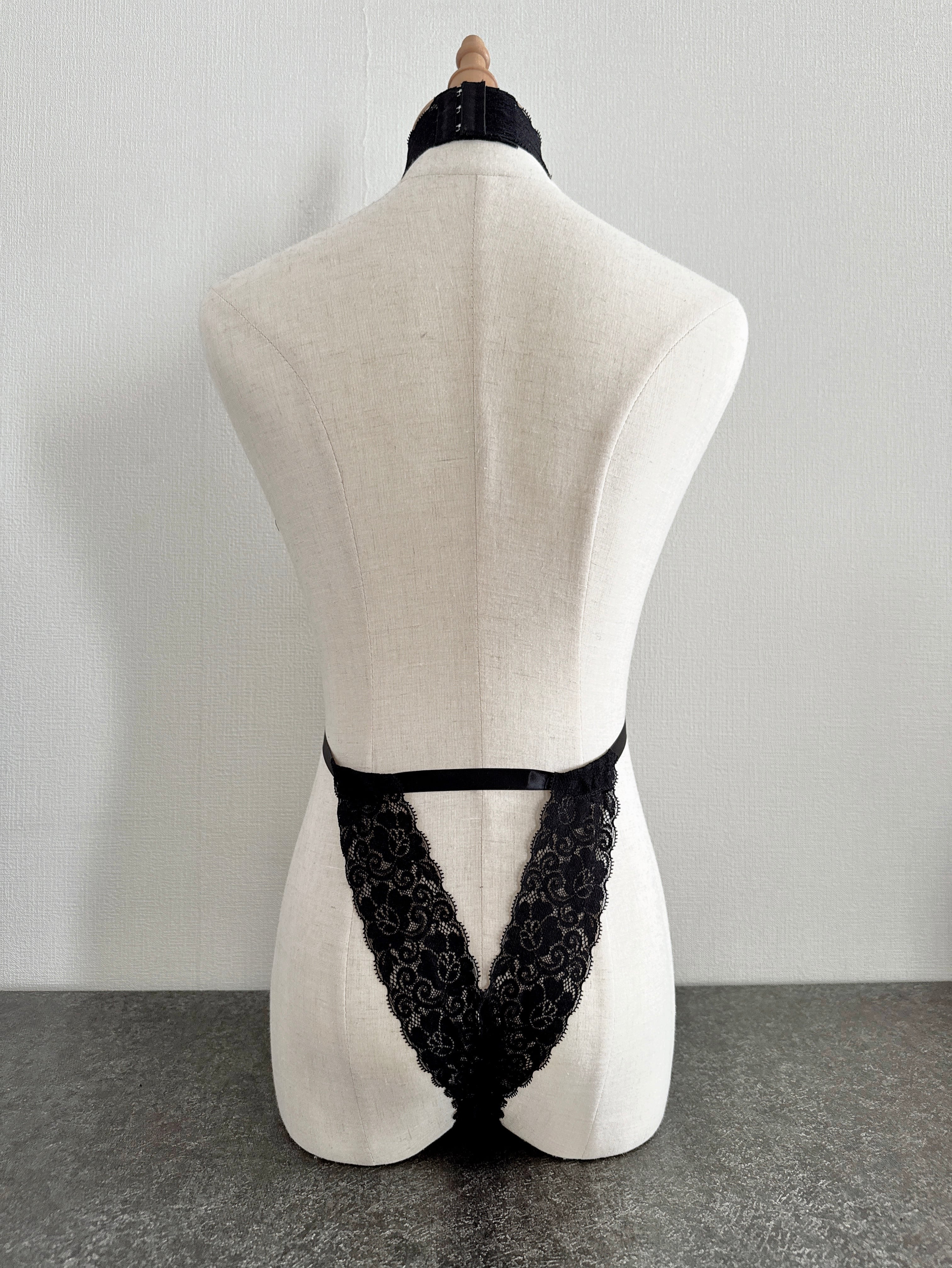 首元から流れるように続くレースラインがボディを美しく縁取り、シンプルながら妖艶な雰囲気を演出します。